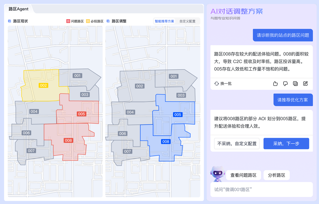 不仅如此,与图的业务区划也实现了“因智而动”。AI能够理解各类网格管理中的实际需求,灵活调整不同场景下的空间管理策略,自动生成最优区划方案。在物流分单场景中,路区智能体能够自动识别问题路区、诊断影响因素、推荐拆分合并方案,经过京东物流的实践验证,站点在保障配送体验的同时人效合理率达到了95%;售后服务也因AI变得更贴心,AI智能预测不同服务的订单需求,结合工程师特征,深度推演服务资源最优的划区方案,使派工改派率下降了30%;在保单分单场景中AI更是“多面手”,通过融合保单、服务人员的时空数据,实现服务连通、区域聚集、保费均衡、单量均衡等不同划区目标,在复杂约束下保证了保险服务时效与质量。
